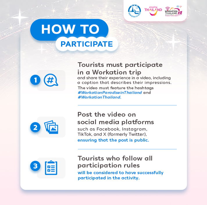 To participate, tourists or expatriates residing in Thailand must embark on a Workation trip. Participants should produce video content and share it on social media platforms such as Facebook, Instagram, TikTok, or X (formerly Twitter), using the hashtags #WorkationParadiseinThailand and #WorkationThailand. Make sure your post is public. The activity is open for participation from now until April 30, 2026. Winners will be announced by May 10, 2026, and must confirm their identity by May 18, 2026.